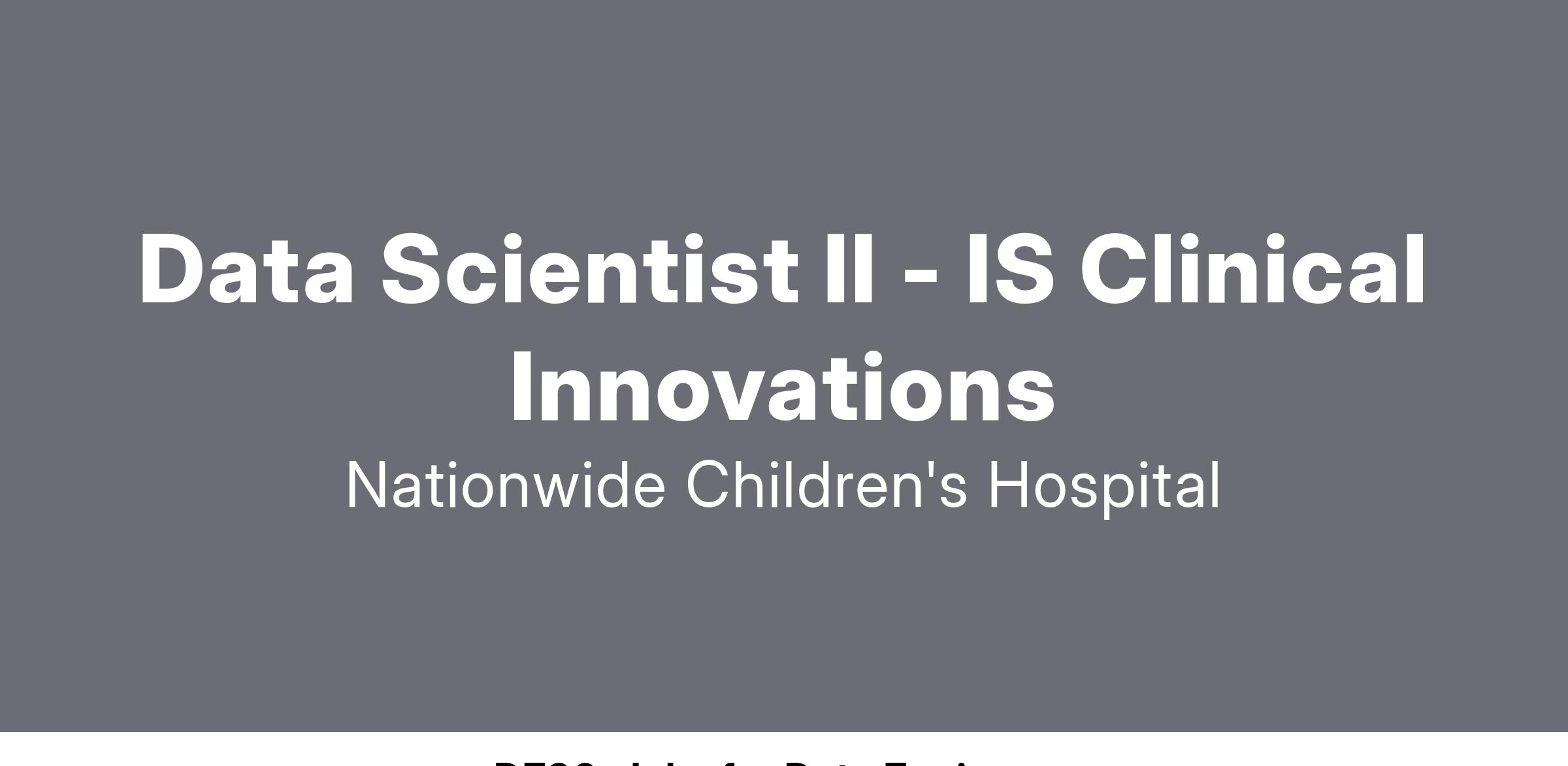R&D division in RISI is looking for motivated individuals who are eager to flex their data analytics muscles to solve intriguing clinical or research problems that may directly or indirectly impact clinical care or operation at Nationwide Children's Hospital. Your work has the potential to have long lasting positive impact to our pediatric patients and help NCH to achieve best outcome in our care delivery. The R&D division of Research Information Solutions and Innovation has a diverse portfolio of clinical informatics research projects ranging from clinical genomics, business data mining, Hadoop and big data analytics, predictive analytics, to social mobile and cloud (SoMoClo) applications. These projects are highly collaborative involving partners in Clinical Informatics, Hospital IS, physicians, researchers, and administrators, both internally and externally. The Data Scientist II position will be part of a team of Data Scientists and Analysts working to organize and analyze large sets of data or complex data sets to discover hidden patterns, trends, and association in support of research, operation, and clinical care at Nationwide Children's Hospital. The candidate must be experienced in leveraging both structured and unstructured data sets to create analytical solutions using tools and/or methods in at least two of the following areas: statistical and predictive analysis, natural language processing, geospatial analysis, and machine learning. The candidate must be able to verbally and visually communicate clearly to all level of stakeholders.