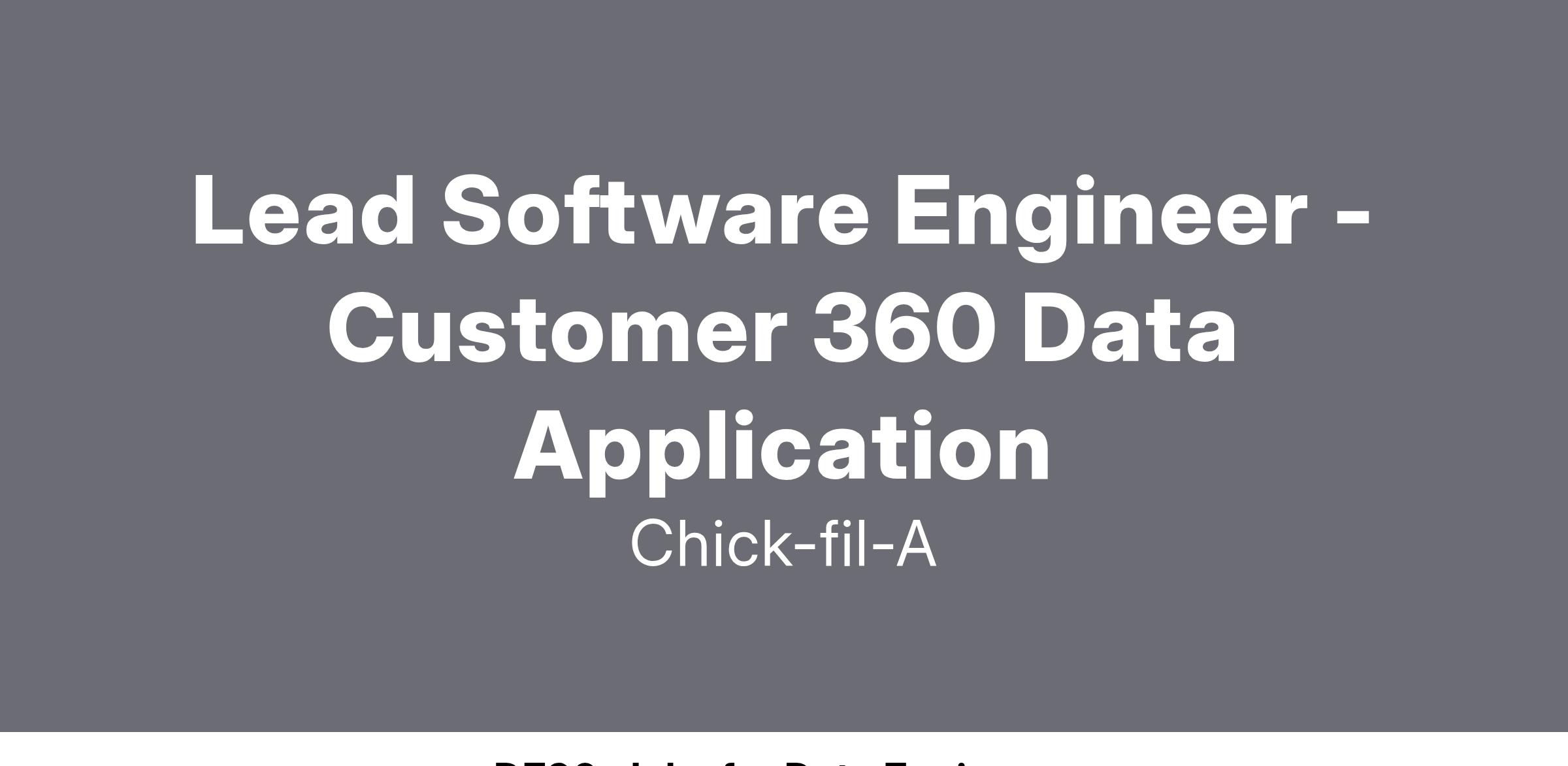 Chick-fil-A is looking for a Lead Software Engineer - Customer 360 Data Application that will serve as the leader to a strong team of Software Engineers responsible for the application development, data management and support of Chick-fil-A's Customer 360 data systems.