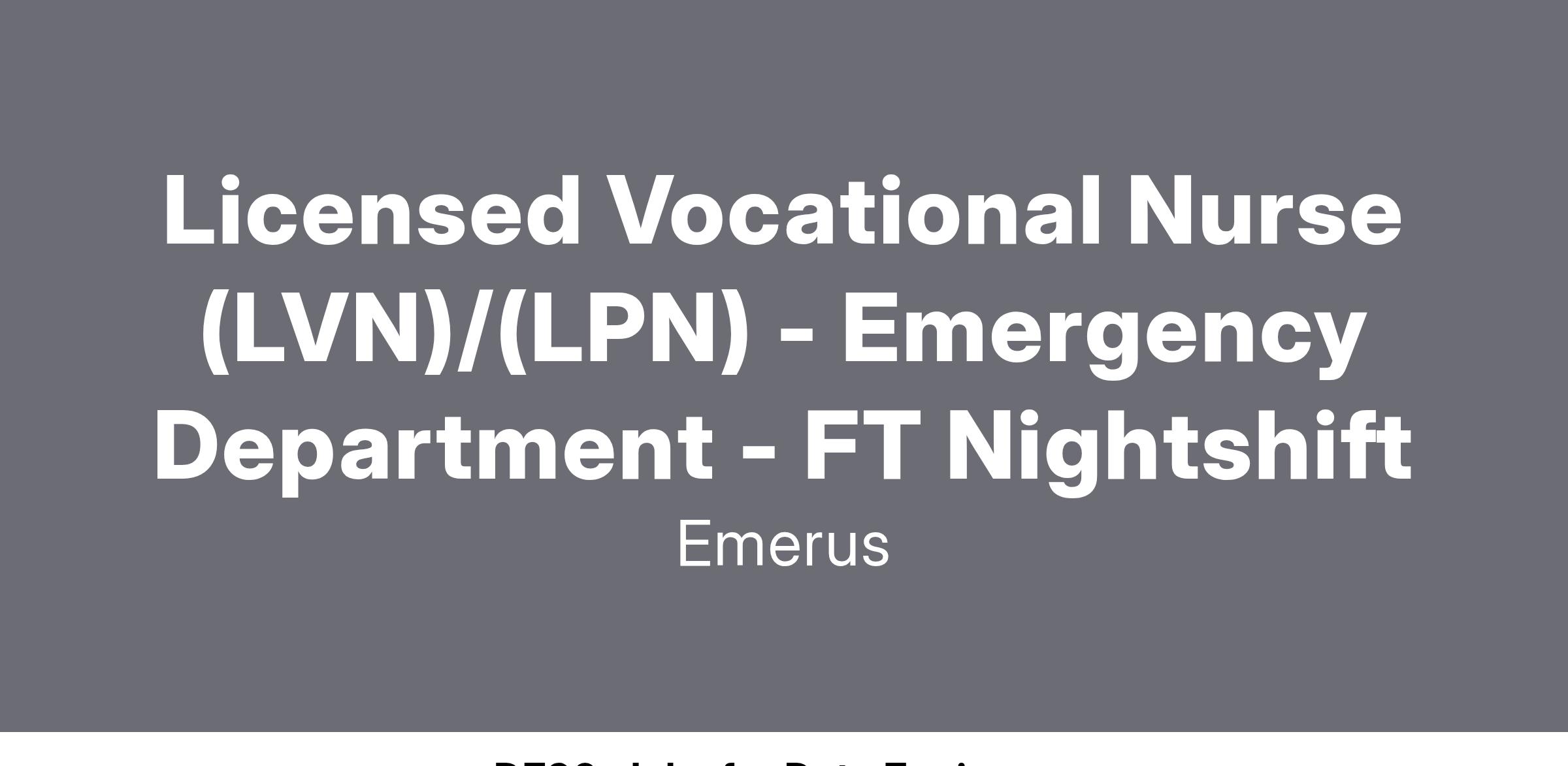 The licensed vocation nurse (LVN) is responsible for providing safe, compassionate, and focused nursing care to assigned patients with predictable health care needs. The LVN works under direct supervision of the registered nurse (RN) and assists with carrying out the patient’s plan of care in accordance with the state’s nurse practice act. Former emergency department or urgent care experience required.