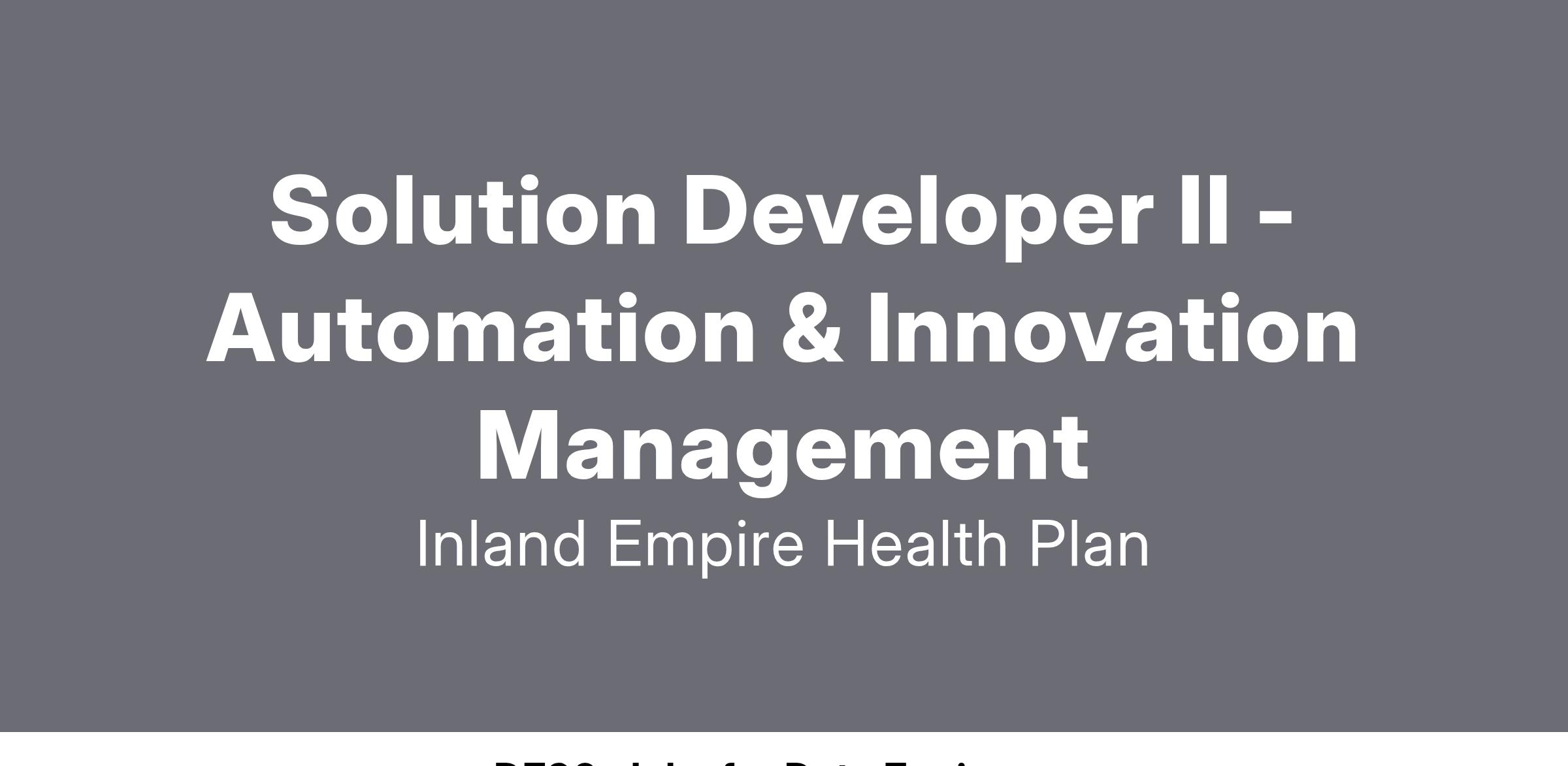 The Solution Developer II - Automation & Innovation Management will focus on key technology domains including business process automation, data curation, industrialized analytics, machine learning & Artificial Intelligence and scalable delivery platform. As a member of the Automation and Innovation Center of Excellence (COE), you'll work as part of a team of problem solvers, helping to solve complex business issues from strategy to execution while contributing to the automation development best practices. Work with Quality Engineering to ensure automated solutions meet the needs, criteria, and business rules and regulations. This position will collaborate with information technology security to ensure the highest product security standards are met.